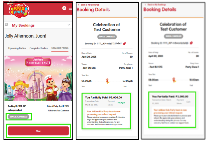 - Locate and scroll your party bookings under three tabs: Upcoming Parties, Completed Parties, Cancelled Parties. Click Manage or View button to the party you need to view and update payment status.