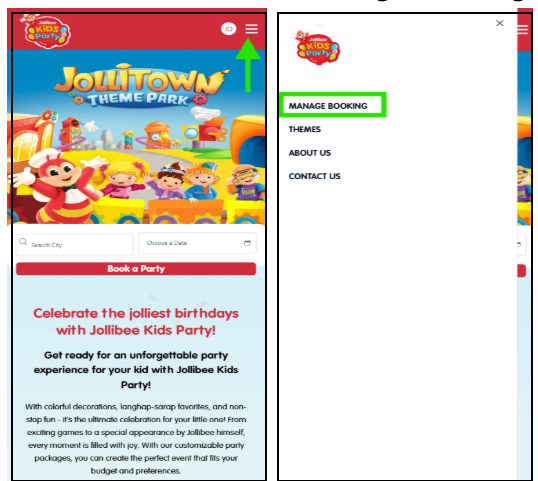 Jollibee Kids Party booking site using your browser. Locate and click the “Login” button in Desktop view or the