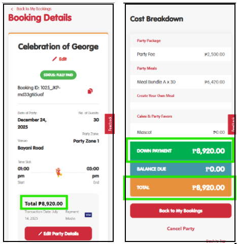 Note: Follow Step 5 How to Pay Downpayment under “How to view and edit party booking for Members“ article.
